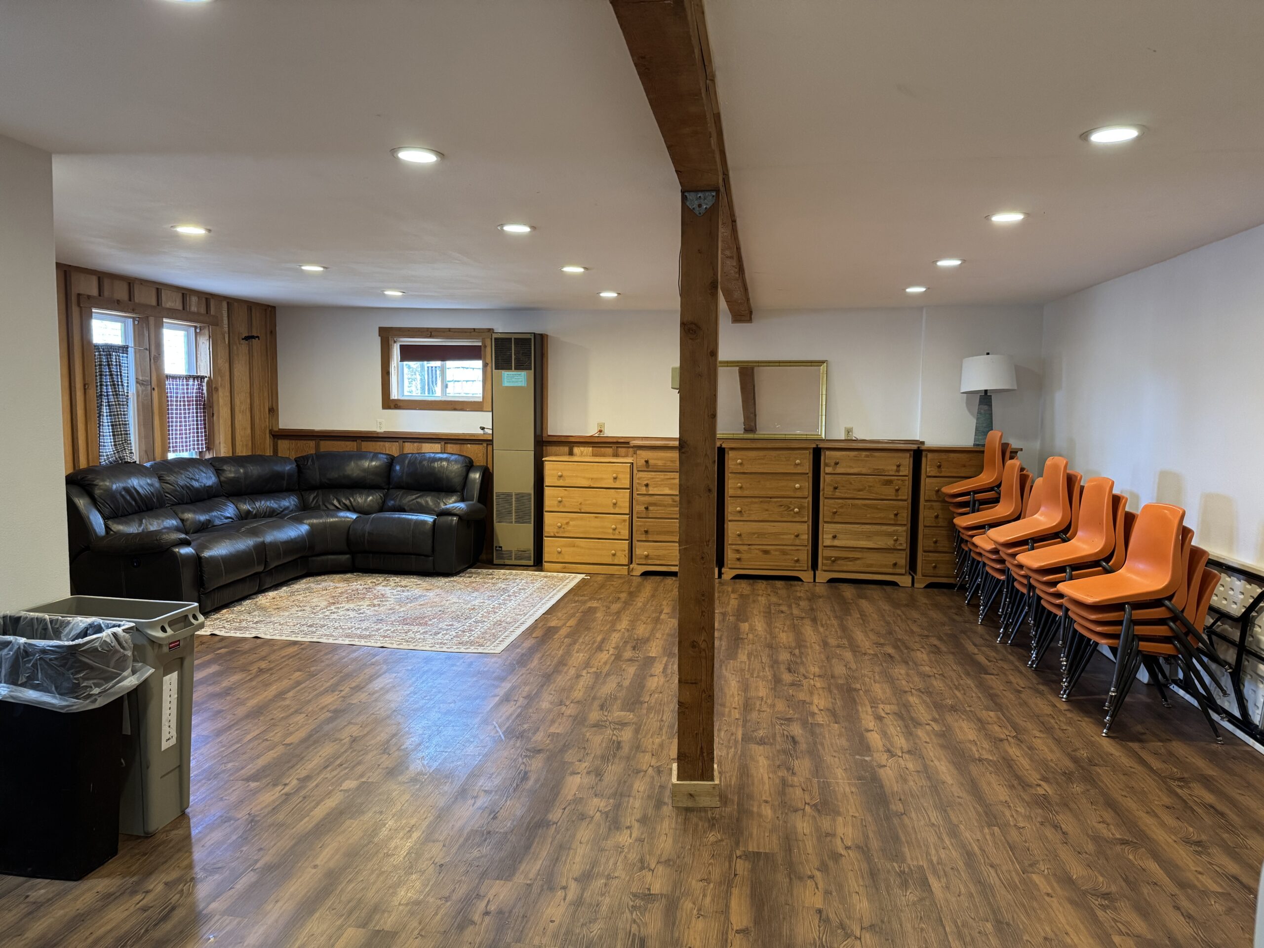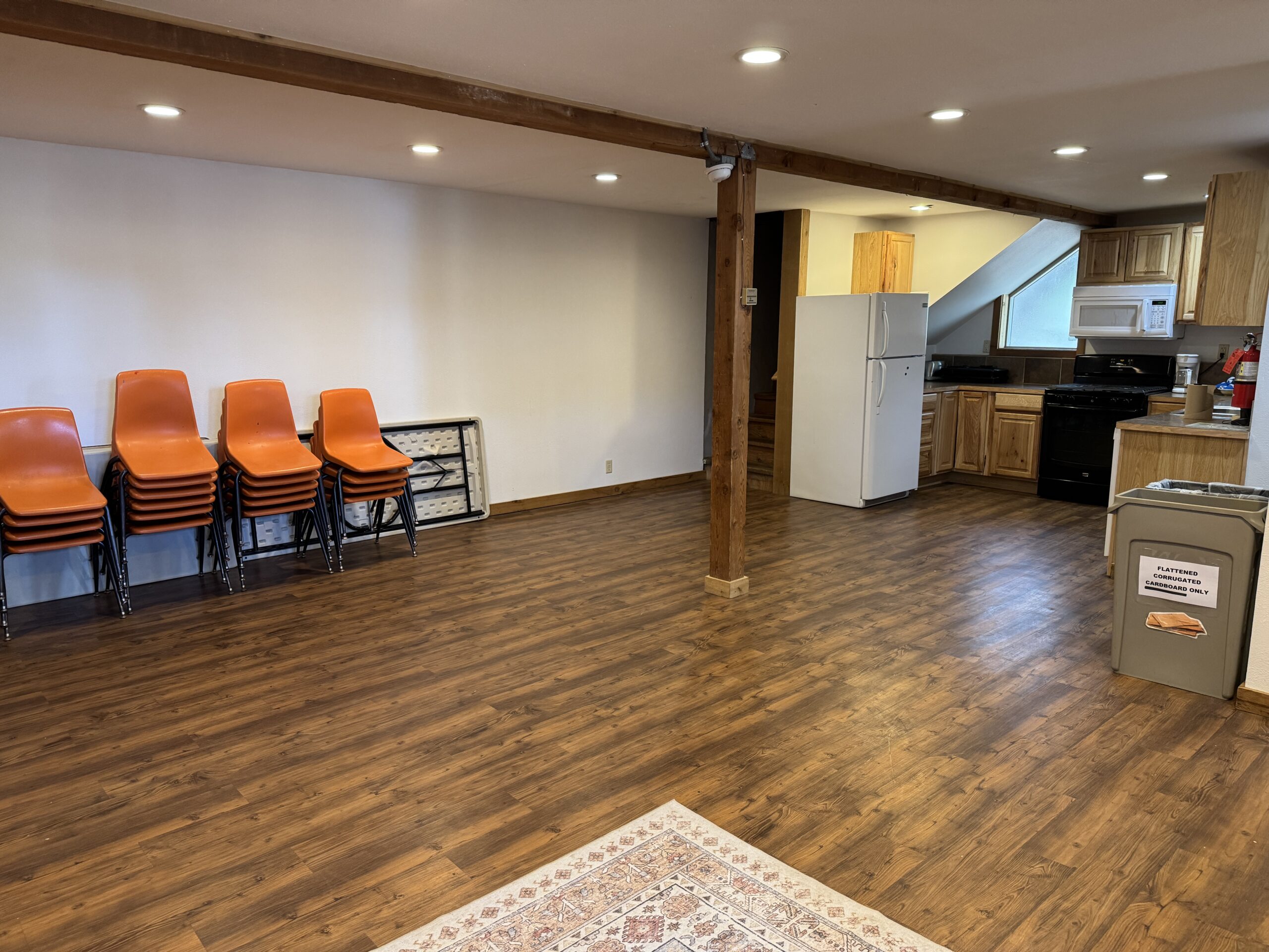 Includes two floors, basement unavailable (sleeps 22). Full kitchen (cooks for 60), sleeping spaces, bathrooms/showers, and meeting space.